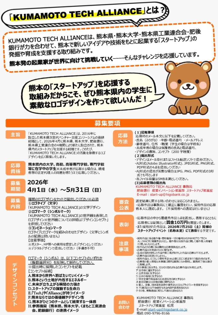 熊本県スタートアップ支援コンソーシアム「KUMAMOTO TECH ALLIANCE」ロゴデザイン募集のご案内