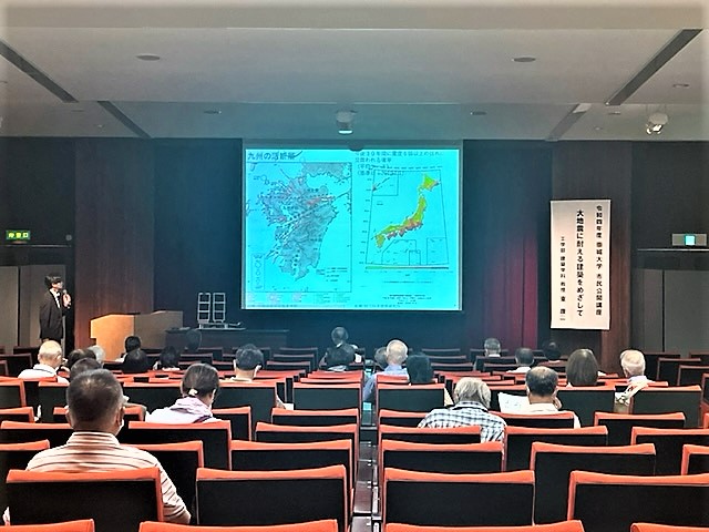 今回のテーマは「大地震に耐える建築をめざして」と題し、工学部 建築学科 東教授が地震のメカニズムと倒壊した建物と倒壊しなかった建物の構造の違い等について解説いただきました。