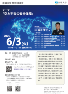 崇城大学では、この度、航空自衛隊 第46代 西部航空方面隊 司令官 空将の稲月秀正氏をお招きして、 「空と宇宙の安全保障」と題し、航空自衛隊の役割や活動の取り組みなどについてご講演いただきます。 奮ってご参加いただきますようお願いいたします。 記 【日 時】 2025年6月3日(火) 10:40~12:10(開場10:00) 【場 所】 崇城大学 池田キャンパス SoLAホール(SoLA3階) (熊本市西区池田4-22-1) 【参加費】 無料 【申込み方法】 以下URLよりお申し込みをお願いいたします。 事前申し込み制 (5/30(金)締切) 〇申込みURL https://forms.office.com/r/8BiYBg1pdE 【備 考】 大学構内へのお車の乗り入れはできません。 公共交通機関をご利用いただくか、お車でお越しの際は学生駐車場をご利用ください。 〇学生駐車場について google map https://goo.gl/maps/Wej3gajH7pSYnZhr6 学生駐車場までの行き方 https://www.youtube.com/watch?v=OWYWCpOAjrU 【お問合せ先】 崇城大学地域共創センター 〒860-0082 熊本市西区池田4丁目22番1号 E-MAIL ken-sien@ofc.sojo-u.ac.jp ★講演会チラシ