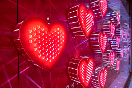 鶴屋百貨店と芸術学部デザイン学科のコラボ企画。地域の企業と若者による街の活性化を目的とした取り組みです。小さなハートで構成された大きなハートは、光の動きや見る角度によって変化します。それぞれのハートの放つ光が周囲のハートへと届くこの作品のように、「気持ちを秘めた」人々が「気持ちを伝える」人々に影響されてその溢れる気持ちを伝えられるようにという思いを込めました。本作品のテーマは”あなたのバレンタイン”です。