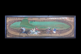 明治時代に描かれた神社所有の絵馬が老朽化により絵具が剥落していたものを、当時の状態に再現する修復を行いました。これは、2018年、神社再建にあたって、元建築学科教員が行った社殿の設計と連動した取り組みです。この絵馬は大変珍しく「競馬」の様子を描いたもので、殆ど前例がなく、当時の競馬に関する資料や錦絵に描かれた競馬の様子を参考にしながら修復しました。