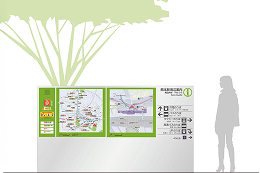 九州新幹線の開通にあわせ、まちづくりが進む熊本駅周辺の案内板(サイン)のデザインを検討。わかりやすさと共に街のイメージアップにつながる周辺や緑との調和を試みる。